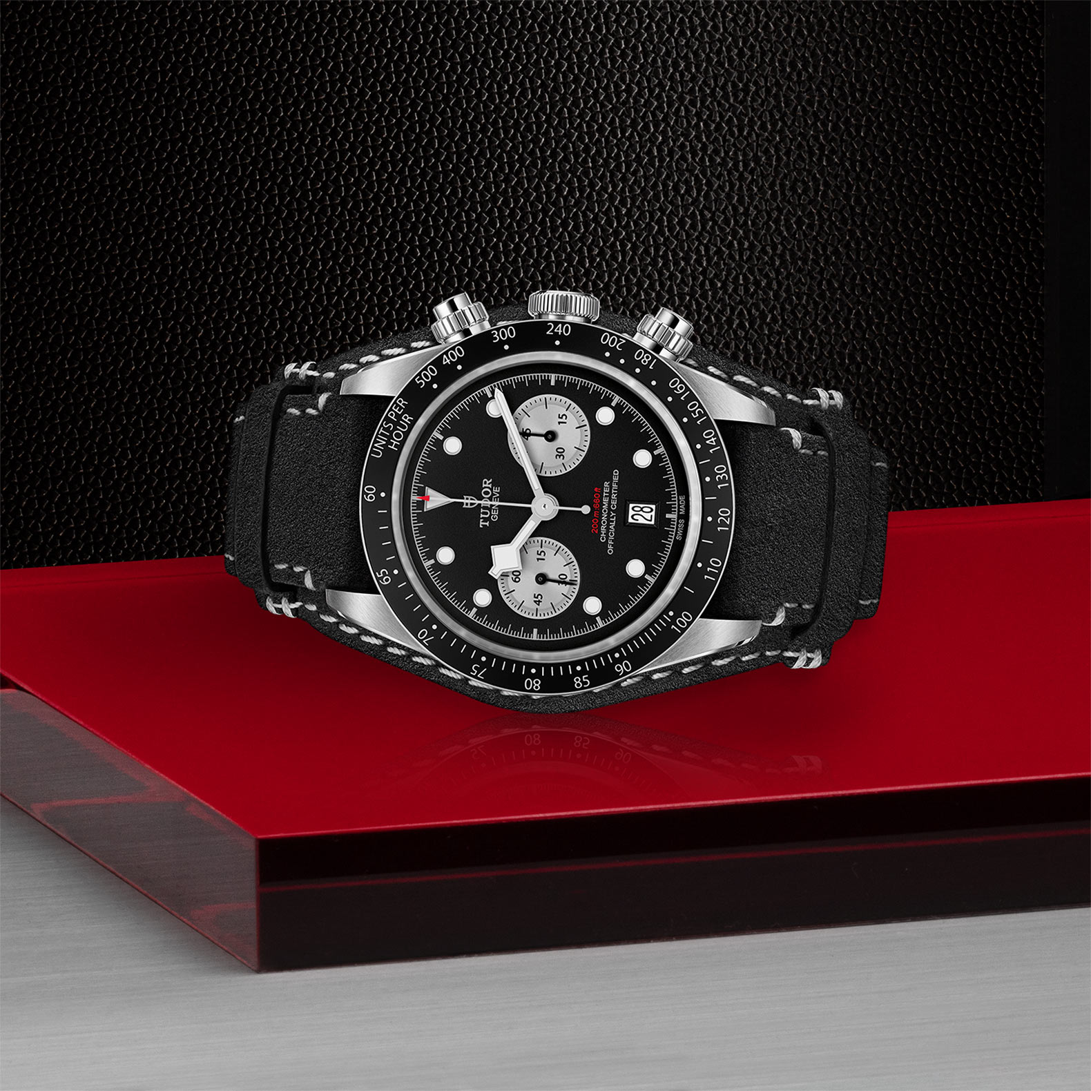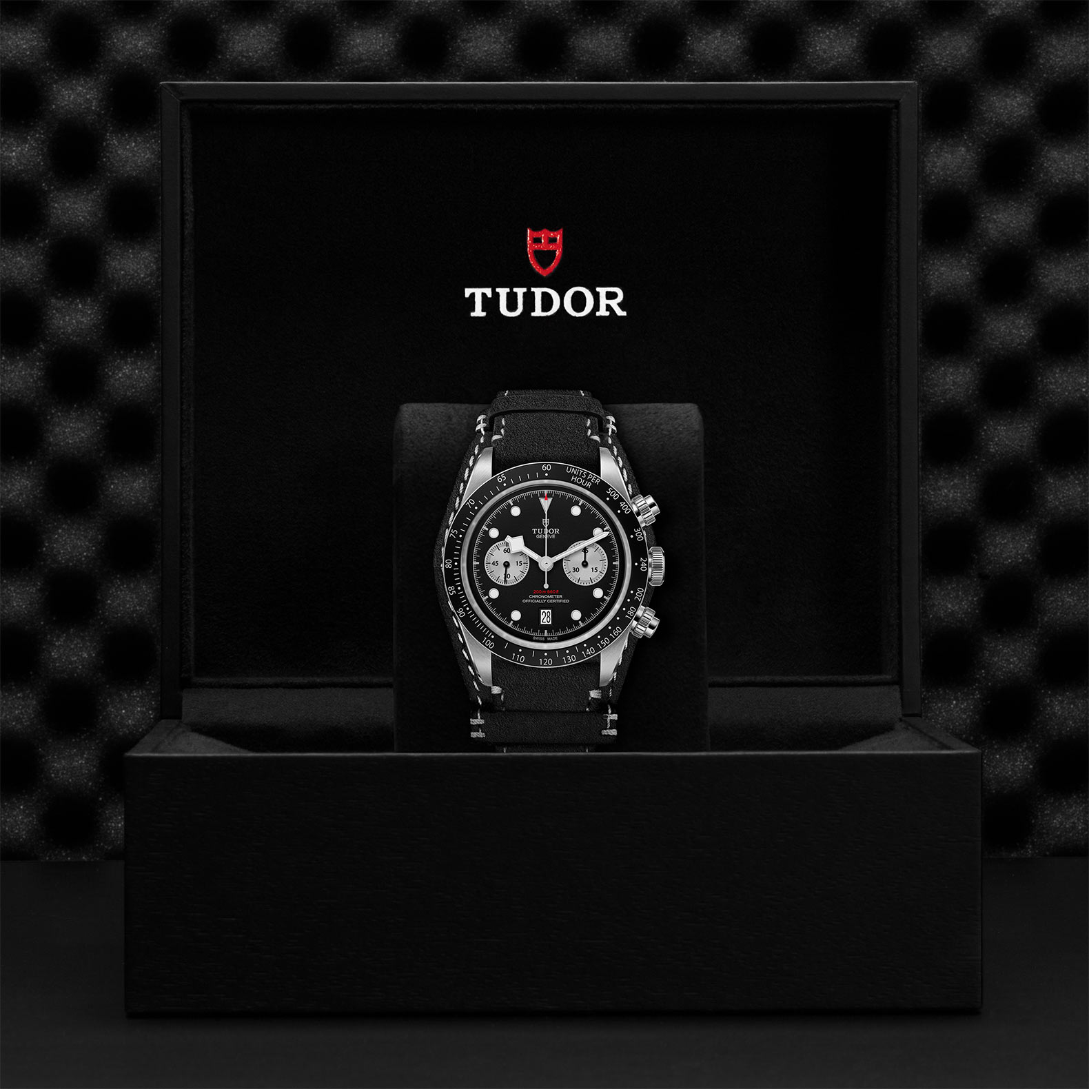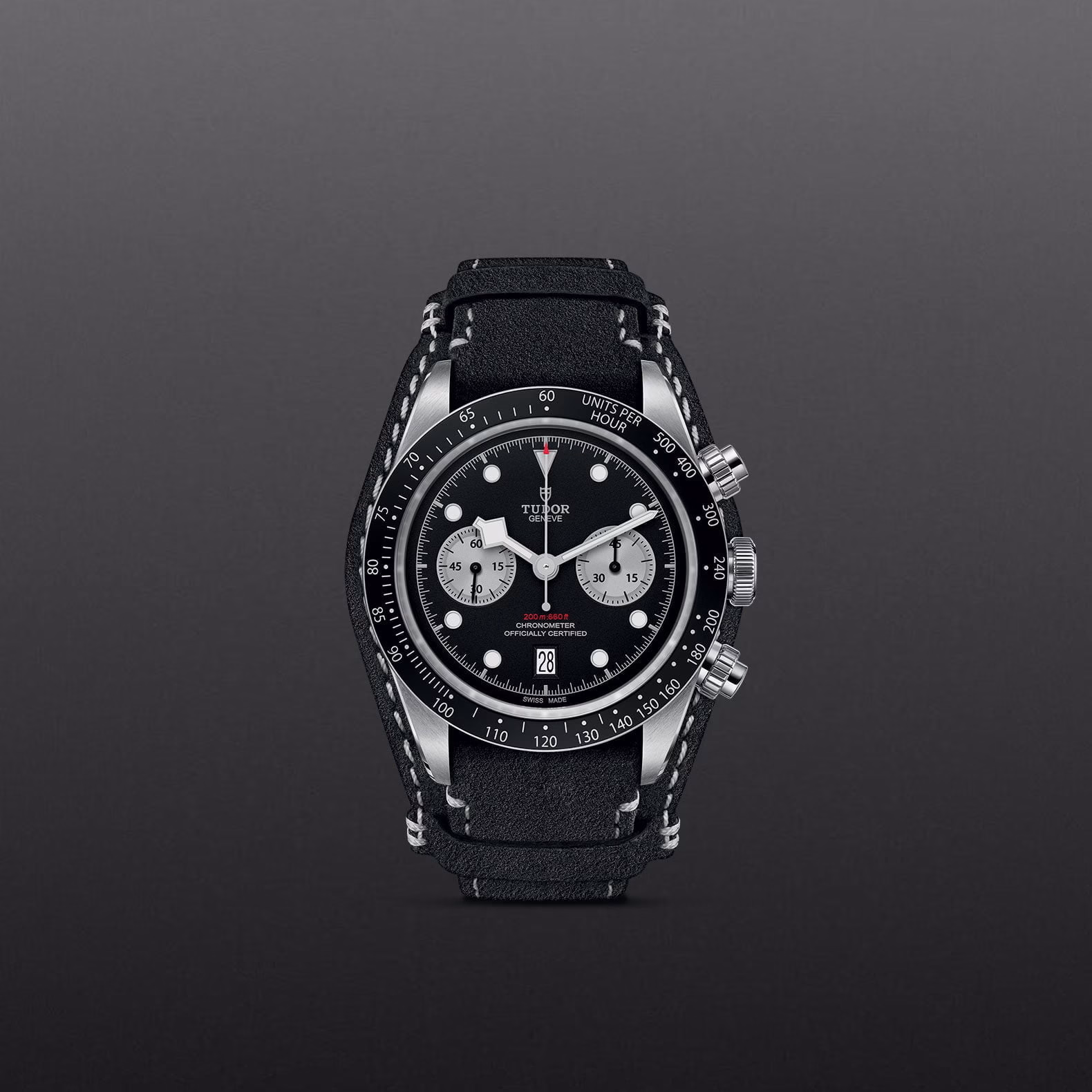 The Black Bay Chrono combines the heritage of divers? watches represented by the Black Bay family with the queen of the racetrack, the chronograph. The characteristics of the Black Bay collection are preserved in a steel case fitted with pushers inspired by the first generation of Tudor chronographs. A fixed bezel in circular satin-brushed steel with engraved tachymetric scale completes the face of this sporty chronograph.