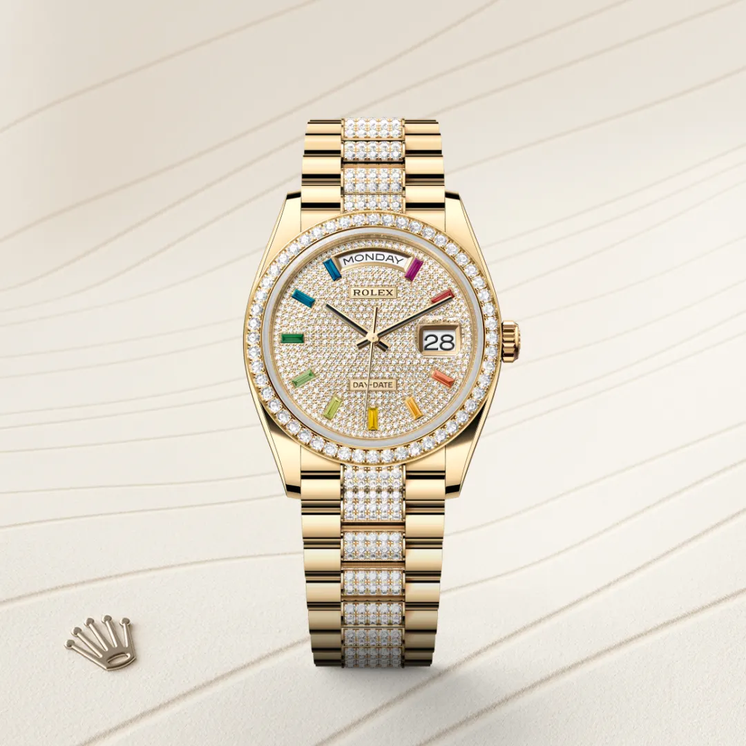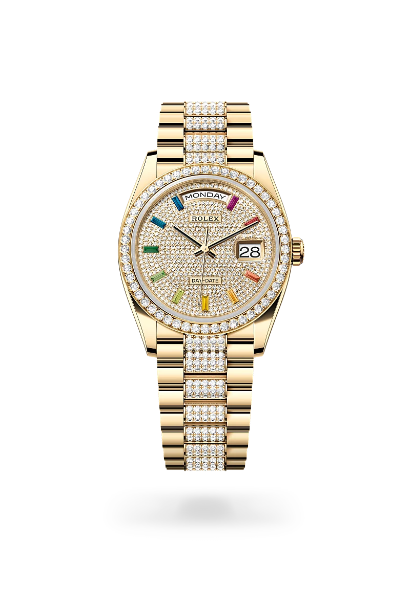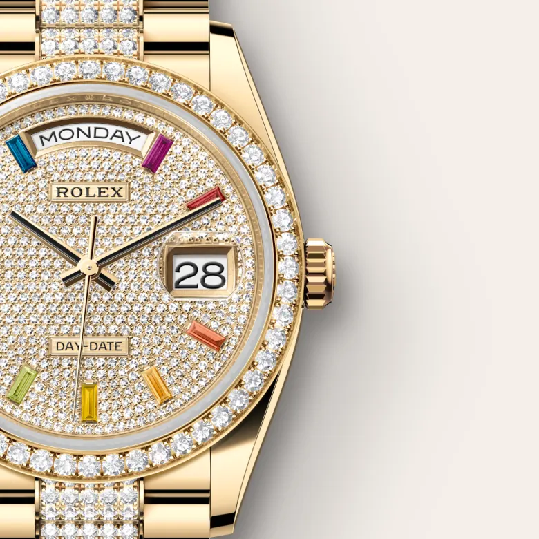 This dial features 10 baguette-cut, rainbow-coloured sapphires. Diamonds, sapphires, rubies, emeralds – the noblest and most precious stones are selected to grace Rolex timepieces. The brand has in-house expertise and equipment enabling it to bejewel any model in its catalogue. Experienced gemmologists first select gemstones of the highest quality. For this, they can rely on their own seasoned judgement as well as state-of-the-art analysis equipment. The stones are then entrusted to the gem-setters, who skilfully place each precious stone onto the watch by hand, one by one, assuring precision to within hundredths of a millimetre. Such stringent tolerances guarantee that each stone shines with optimal brilliance and is perfectly aligned with those around it. These time-honoured gestures, which may be repeated many hundreds of times, ensure that each gem-set watch produced by Rolex sparkles with exceptional intensity and reflects the standard of excellence required by the brand.