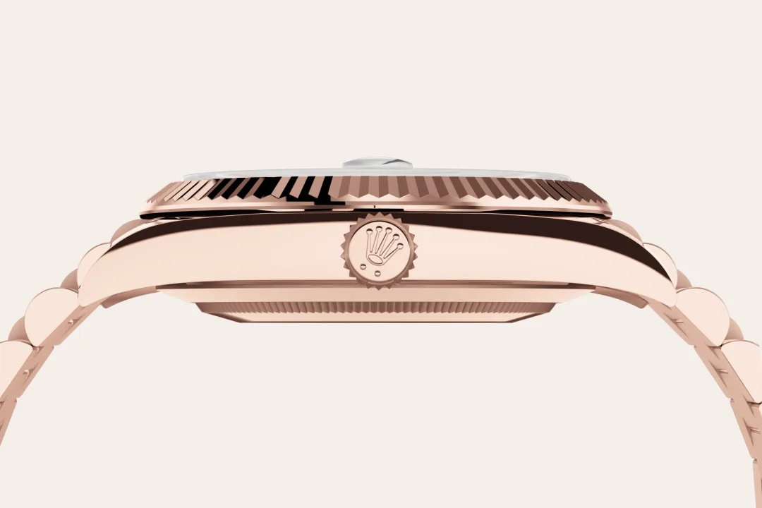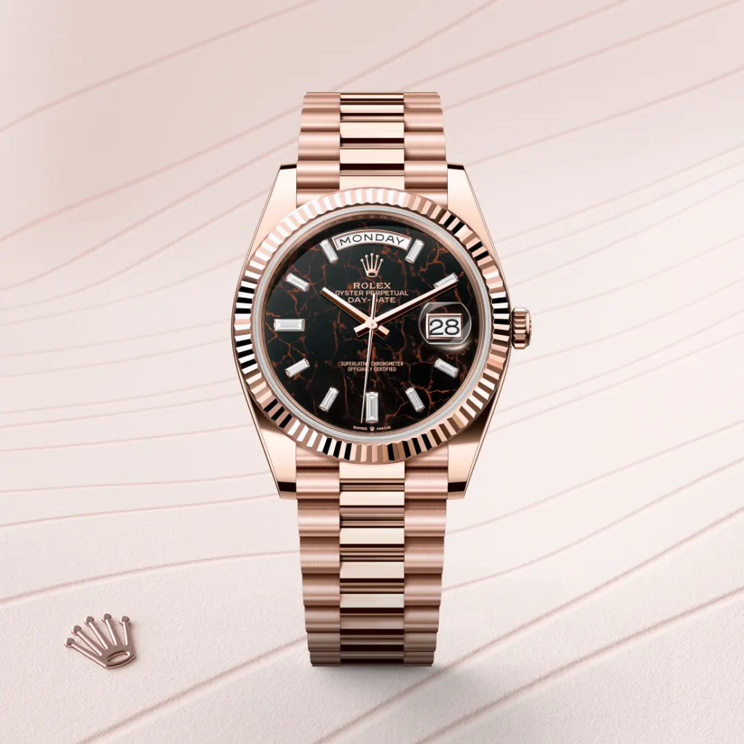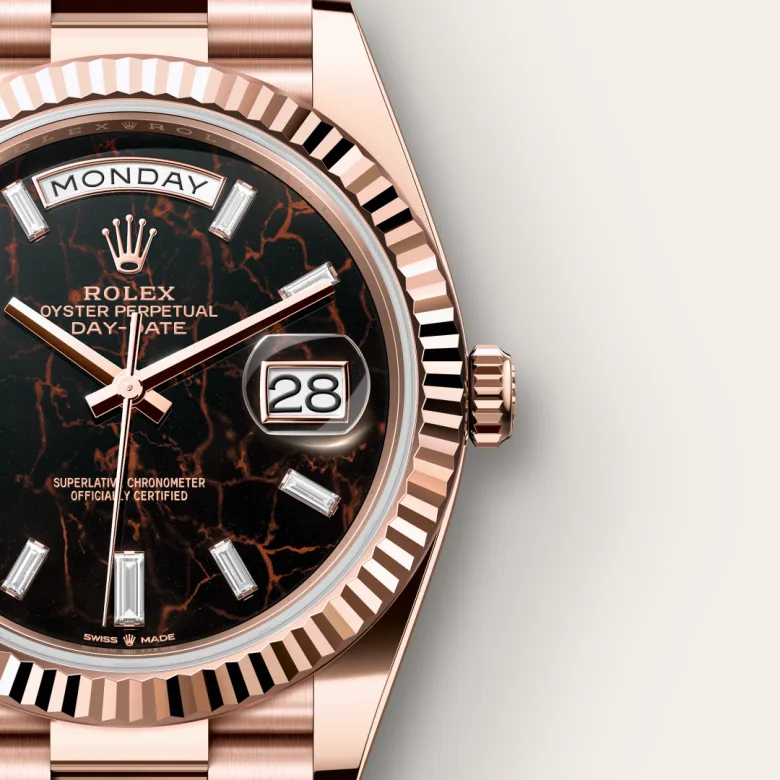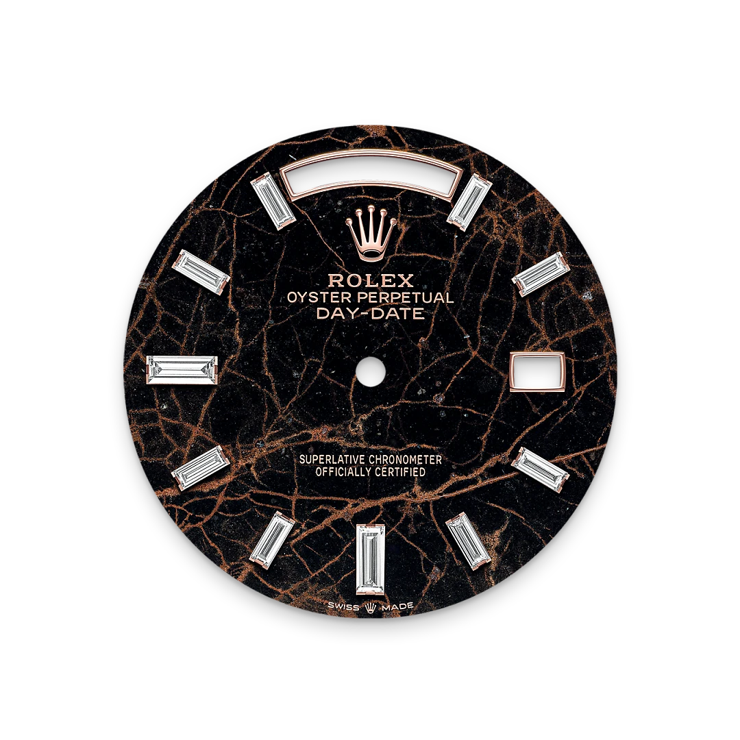 This dial features 10 baguette-cut diamonds. The Oyster Perpetual Day-Date 40 is presented with a dial made from eisenkiesel, a deep brown decorative stone used by the brand for the first time in 2021. Eisenkiesel is an iron-oxide, delicately veined quartz. The stone discs destined for the dials are cut from a block of raw material. Only those whose colour and structure fully satisfy the brand’s exacting aesthetic requirements are selected. They will grace the dial of a Rolex watch, conferring it with a unique personality.