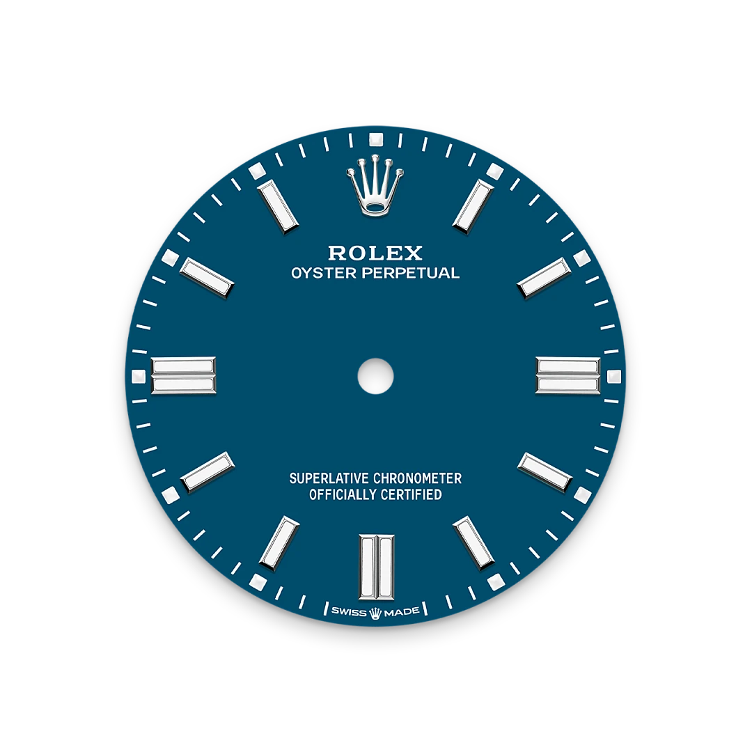 The colours created for the Oyster Perpetual range start life as a lacquer, which must be meticulously applied in a controlled-atmosphere environment to avoid dust and other contamination. The brass plate of the dial base receives layer upon layer of lacquer, six in all, to form a regular, uniform surface. The last step is varnishing and polishing to bring out the full brilliance and depth of colour. The various inscriptions are then pad printed, and the hour markers and crown riveted by hand. The dial, gleaming in its perfection, is all set to take its place on top of the movement at the watch assembly phase.