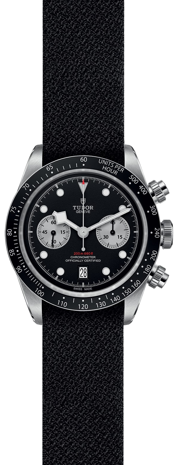 In 1970, TUDOR introduced its first chronograph, the Oysterdate. A watch that was both robust and functional, its unique design was characterised by its bright colours, its pentagonal hour markers shaped like a baseball home plate, its 45-minute counter and its date function at 6 o’clock. Immediately adopted by the world of motorsport, it paved the way for more than 50 years of technical chronographs that TUDOR has never stopped improving.